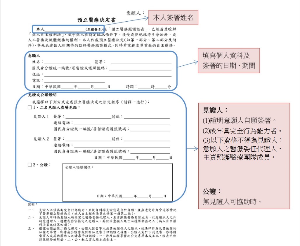 記得簽妥「預立醫療決定書」,鼓勵您可在預立醫療照護諮商後現場簽署完成,若您還需要考慮,也可回家簽署,但別忘了必須完成見證或公證欄位。