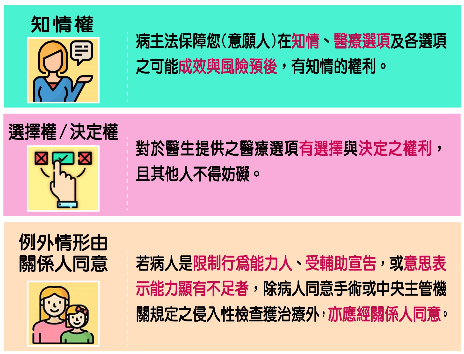 《病人自主權利法》是台灣首部以病人為主體的法案,於2019年1月6日施行,立法目的為尊重病人醫療自主、保障其善終權益、促進醫病關係和諧,保障每個人的知情、選擇、接受或拒絕醫療的權利,確保病人善終意願在意識昏迷、無法清楚表達時,自身意願都能獲得法律的保障與貫徹,同時也可以指定醫療委任代理人代為表達意願。